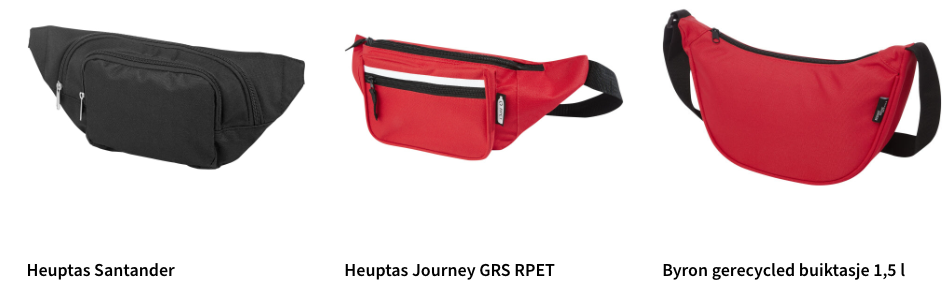 Heuptasjes zijn momenteel bijzonder trendy – daar zijn tal van redenen voor: belangrijke spullen worden direct op het lichaam opgeborgen, direct binnen handbereik, en ook de uitstraling van heuptassen ziet er geweldig uit. Heuptassen zijn vooral waardevol op reis – voor de dragers en uw bedrijf! Omdat uw logo daar niet over het hoofd kan worden gezien: uw reclame-opdruk op bedrukte heuptasjes is de ultieme blikvanger! net zo als de boodschappentassen