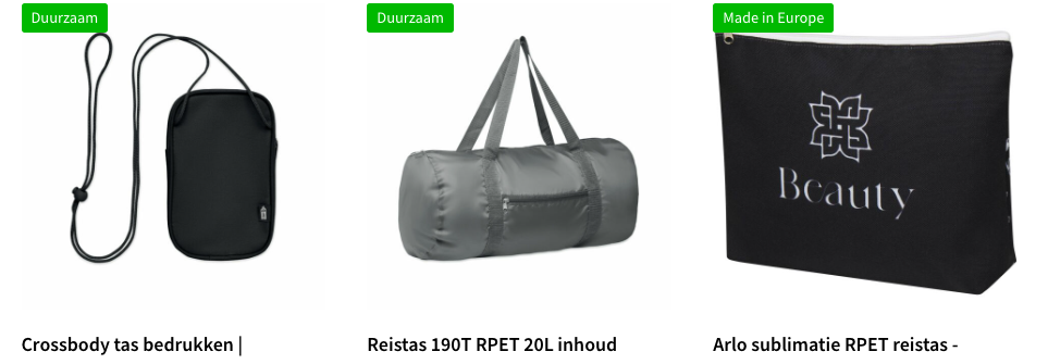 Promoot je actieve reizen of run je een fitnessstudio? Dan zijn de gecombineerde reissporttassen voor jou interessant, die ook geschikt zijn als weekendtassen voor stadsreizigers. Eigenaren van fietsenwinkels of touroperators moeten onze weerbestendige fietstassen eens nader bekijken. Maar ook voor een veel grotere doelgroep zijn bedrukte reistassen interessant. Sportliefhebbers, saunabezoekers, strandgangers en zelfs shoppers kunnen gebruikmaken van de praktische, ruime tassen met uw bedrijfslogo.